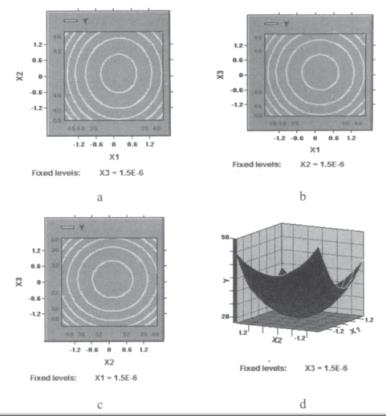 利用響應(yīng)面分析法[1]化枸杞子渣超微粉碎工藝參數(shù)。在單因素預(yù)試驗基礎(chǔ)上,用SAS軟件系統(tǒng)進(jìn)行響應(yīng)面分析,設(shè)計一個三因素五水平的回歸方程來擬合因素和指標(biāo)(響應(yīng)值)之間的函數(shù)關(guān)系。選擇球料比(X1)、枸杞子渣漿液濃度(X2)和攪拌器轉(zhuǎn)速(X3)作為因素,以粉碎后的顆粒粒度d50作為響應(yīng)值對球磨機(jī)濕法超微粉碎工藝進(jìn)行化。